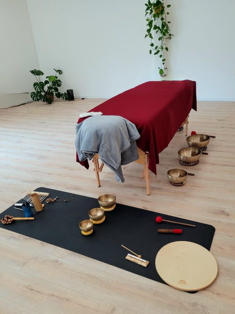 Lors d’une séance de soin sonore, vous êtes habillé et confortablement habillé sur une table de massage, dans un environnement calme et apaisant, pendant que les sons enveloppent l’espace. Les bols sont posés à côté de vous et peuvent être posés sur le corps.